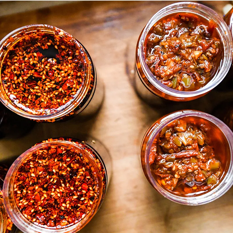 Острый перец соус с маслом, широко известное как масло чили, получают путем кипячения рапсового масла с добавлением порошка сушеного чили. После охлаждения добавьте немного масла в любую еду для придания ей острого и ароматного вкуса. Его также можно готовить с курицей или грибами для придания им аромата и остроты. Оно также хорошо хранится.