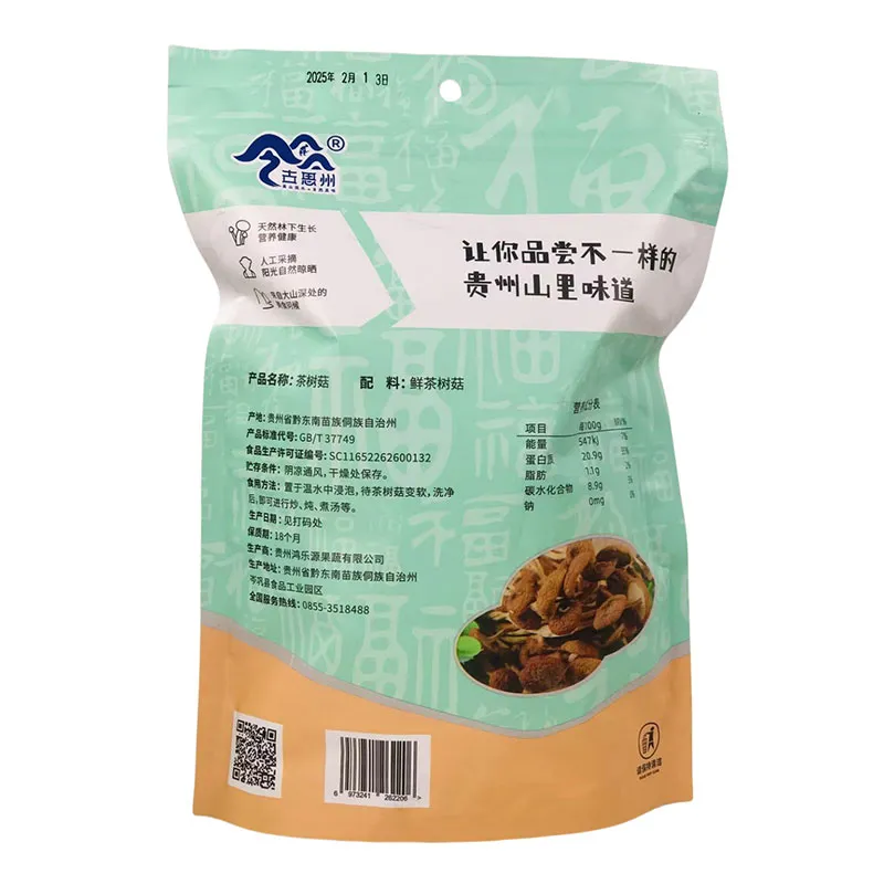 Грибы чайного дерева, выращенные методом дикого выращивания в высокогорных лесах, стали вкуснее и питательнее. Грибы чайного дерева— это встречающийся в природе съедобный гриб с высоким содержанием белка, низким содержанием жира, экологически чистый и не содержащий пестицидов, обладающий богатым питательным профилем. Он богат незаменимыми аминокислотами, такими как аспарагиновая и глутаминовая кислоты, а также более чем десятью минералами, микроэлементами и полисахаридами. Он вкусен и идеально подходит в качестве основного блюда или приправы.